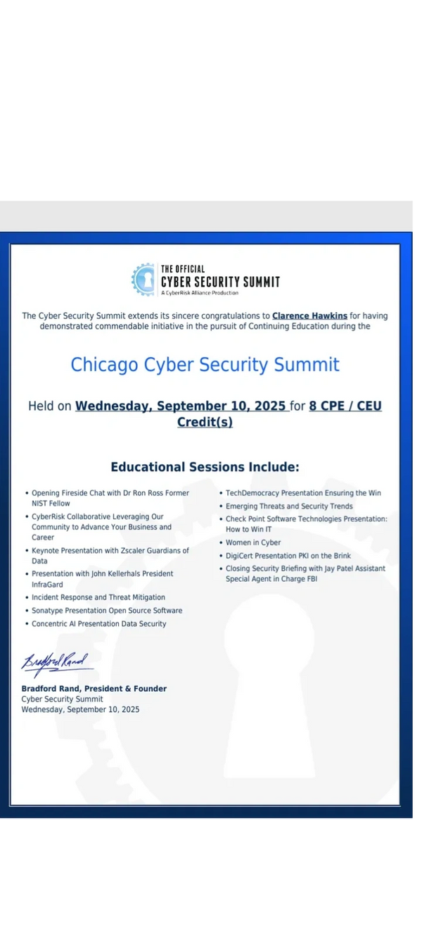 We are proud to acknowledge receipt of our Certificate of Attendance from The Official Cybersecurity Summit—a nationally recognized gathering of industry leaders, innovators, and security professionals.